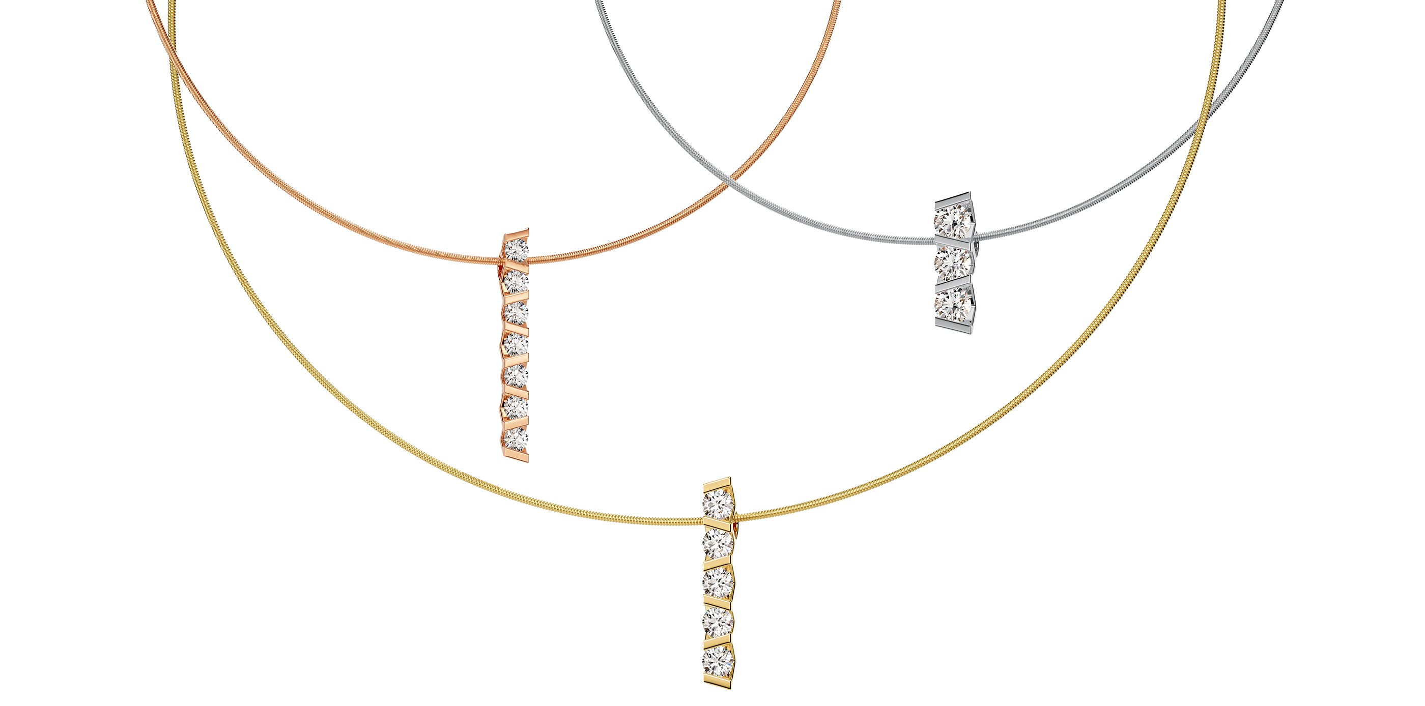 It follows the organic line of the neck and allows pendants to appear free – without visible eyelets.